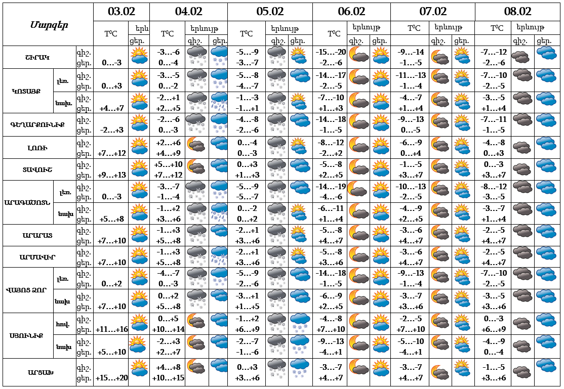 Փետրվարի 3-ի ցերեկը, 6-8-ին սպասվում է առանց տեղումների եղանակ: