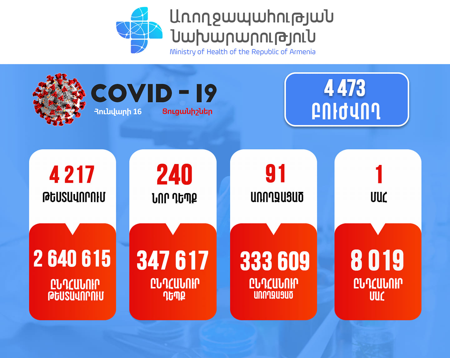 Հայաստանում հունվարի 16-ի դրությամբ հաստատվել է կորոնավիրուսով վարակման 240 նոր դեպք, վարակվածների ընդհանուր թիվը հասել է 347 617-ի: