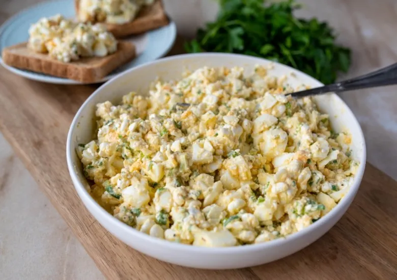 Сваренные вкрутую яйца измельчить на яйцерезке, мелко порезать ножом или натереть на крупной терке. Колбасный копченый сыр на полчаса убрать в морозилку, чтобы он стал более твердым и затем натереть на крупной терке. Чеснок измельчить с помощью чеснокодавки или натереть на мелкой терке. Все ингредиенты соединить в миске, посолить, добавить майонез и перемешать. Еврейскую закуску можно поставить на стол как салат или подать с хлебом в качестве бутербродов. Это сытный и вкусный перекус или ужин.