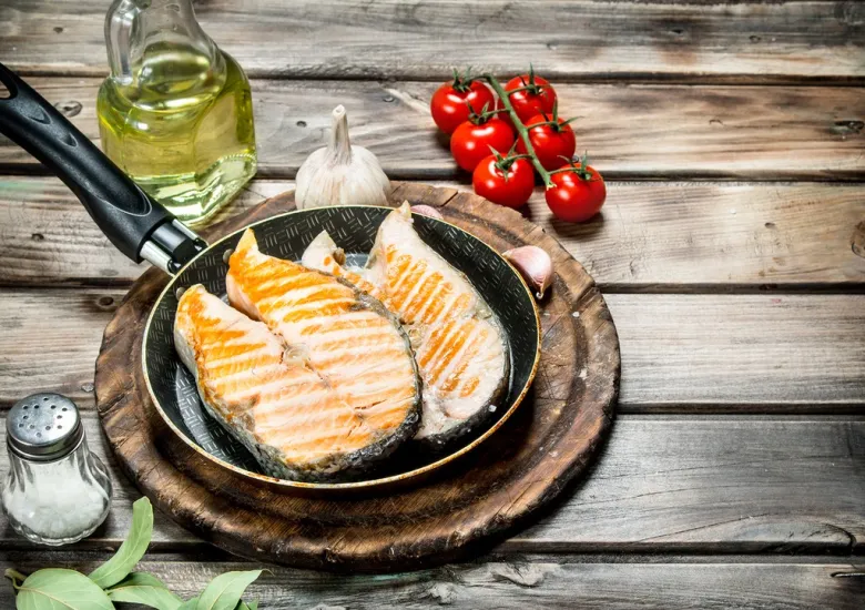 - Рыбу можно запечь в духовке или обжарить на сковороде. Можете выбрать тот вариант, который больше нравится вам и вашей семье. Запеченные стейки советуем держать в духовке 10 минут. Не забудьте предварительно залить в форму для запекания маринад — так вкус рыбы станет насыщеннее. Обжаривать стейки следует примерно по 3 минуты с каждой стороны на раскаленной сковороде.