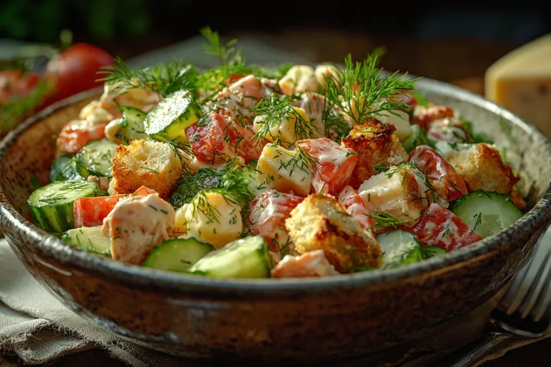 - Подача: выложите салат в красивую тарелку, украсьте зеленью и дополнительно посыпьте сухариками. Можно подавать сразу или немного охладить.