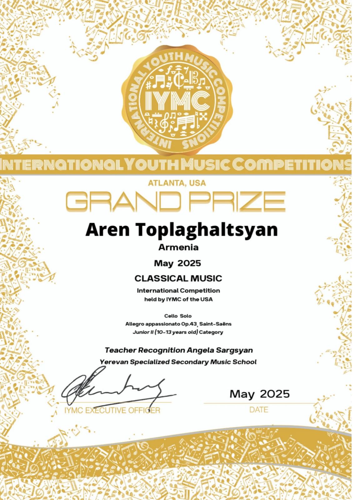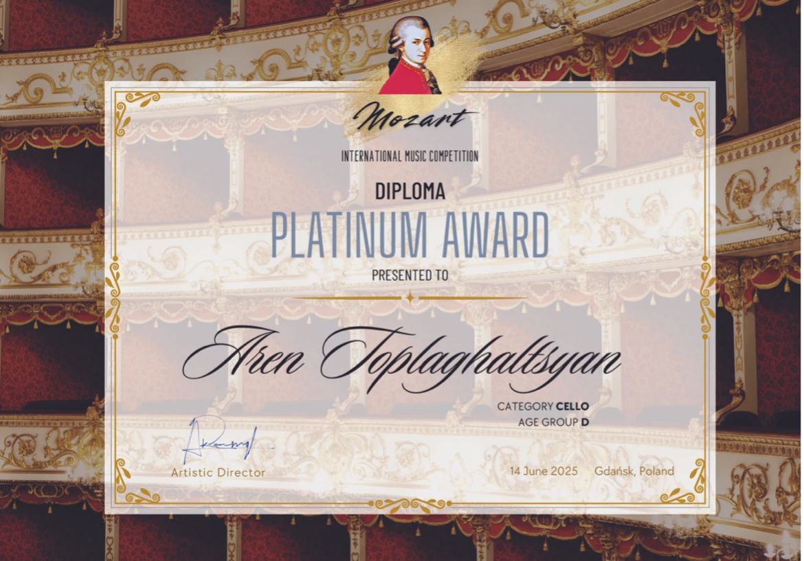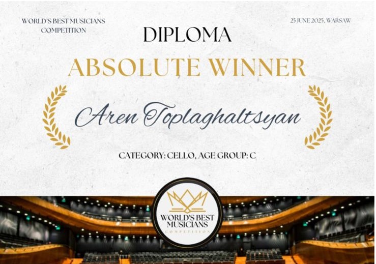 Для виолончелиста Арена Топлагалцяна, стипендиата фонда «Музыка во имя будущего», июнь, похоже, стал временем сбора международных наград. В этом месяце ему удалось принять участие в международном конкурсе «International Youth Music Competitions» и выиграть Гран-При. «International Youth Music Competitions» предоставляет музыкантам платформу. Конкурс фокусируется на всех музыкальных стилях и инструментах.