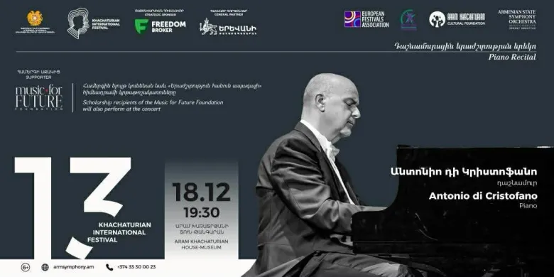 18 декабря в рамках XIII Международного фестиваля Арама Хачатуряна в Доме-музее Арама Хачатуряна при поддержке фонда «Музыка во имя будущего» состоится сольный концерт итальянского пианиста Антонио ди Кристофано. В концерте также примут участие стипендиаты фонда «Музыка во имя будущего». В программе вечера: «Арабеска до мажор, соч. 18» Роберта Шумана (6 минут), «4 баллады, соч. 10» Иоганнеса Брамса (22 минуты), «Долина Обермана» № 6 ля минор из сюиты «Годы странствий» Ференца Листа, S. 160 (14 минут), Соната для фортепиано, соч. 1 Альбана Берга (10 минут), Полонез № 7 ля-бемоль мажор, соч. 61, «Полонез-фантазия» Фредерика Шопена (14 минут).