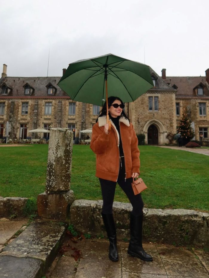 У Анны Карапетян - пример так называемого quiet confidence look. Здесь нет резких акцентов, но есть сильная структура. Дублёнка STAND STUDIO задаёт объём и фактуру, чёрная база вытягивает силуэт, а сапоги в конном стиле добавляют аристократичную строгость. Hermès Kelly Pochette звучит очень деликатно - как элемент вкуса, а не демонстрации.