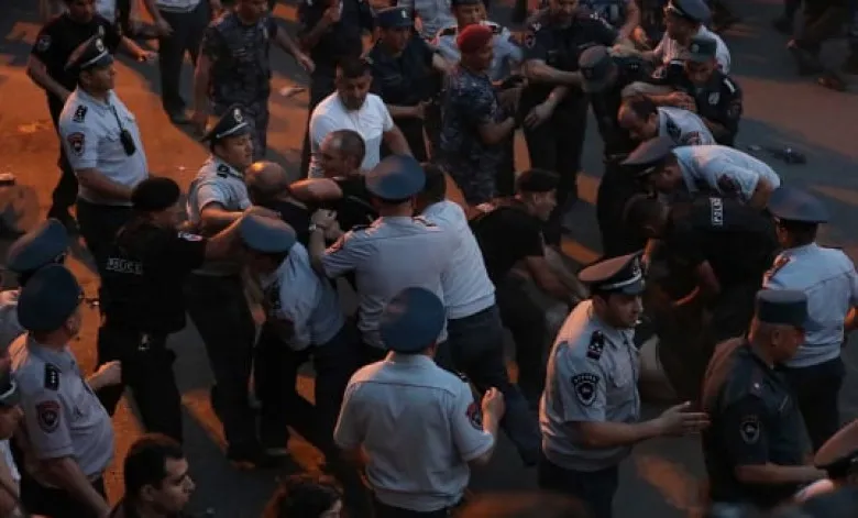 А вот, в Армении пашиняновские власти с помощью силовиков жестоко нападали на мирных демонстрантов, оппозиционных деятелей, журналистов. Избивали, таскали туда-сюда, арестовывали, сажали в тюрьму. Полицейские бросали в мирных демонстрантов 30 или более гранат, в результате чего 100 и более человек были ранены, искалечены…