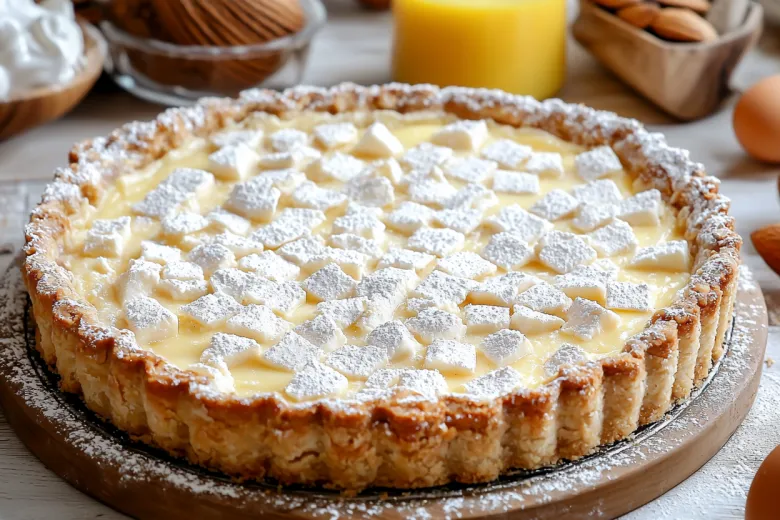 Достаньте готовый пирог из духовки и остудите его. Перед подачей посыпьте сахарной пудрой и при желании украсьте миндальными лепестками или кокосовой стружкой.