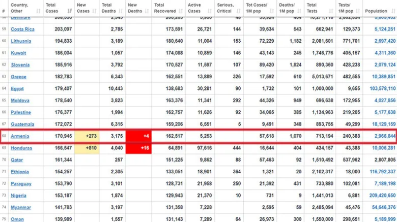 С начала пандемии по официальным данным в Армении скончались 3 983 человека с коронавирусом.