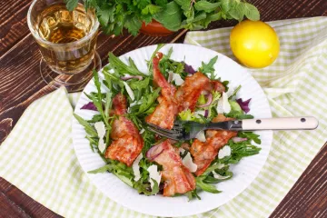 Сытный ужин — простой картофельный салат с руколой и беконом